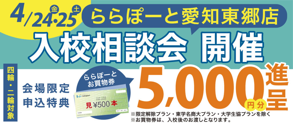 - ららぽーと愛知東郷にて入校相談会開催!お得な特典あり!【4/24(金)、25(土)】